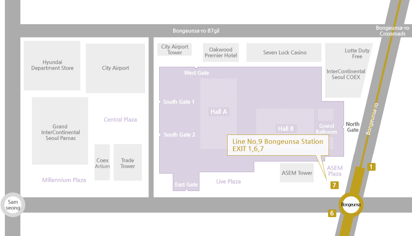 in detail | Enter through the passage directly connected to Bongeunsa Station Exit 7, or access Starfield Coex Mall via ASEM Plaza |