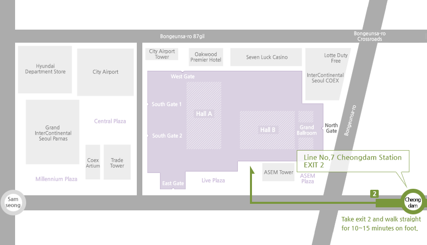 in detail | After exiting Cheongdam Station through Exit 2 (front end of the train), walk straight for about 10-15 minutes and enter via ASEM Plaza. |